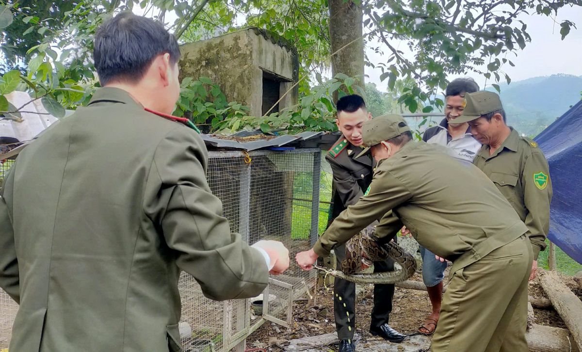 Cụ thể, ông Quách Văn An, sinh năm 1979 trú tại thôn Rộc Răm, xã Yên Thọ, tỉnh Thanh Hóa đã tự nguyện bàn giao một cá thể trăn gấm (trọng lượng trên 10kg) cho lực lượng chức năng.