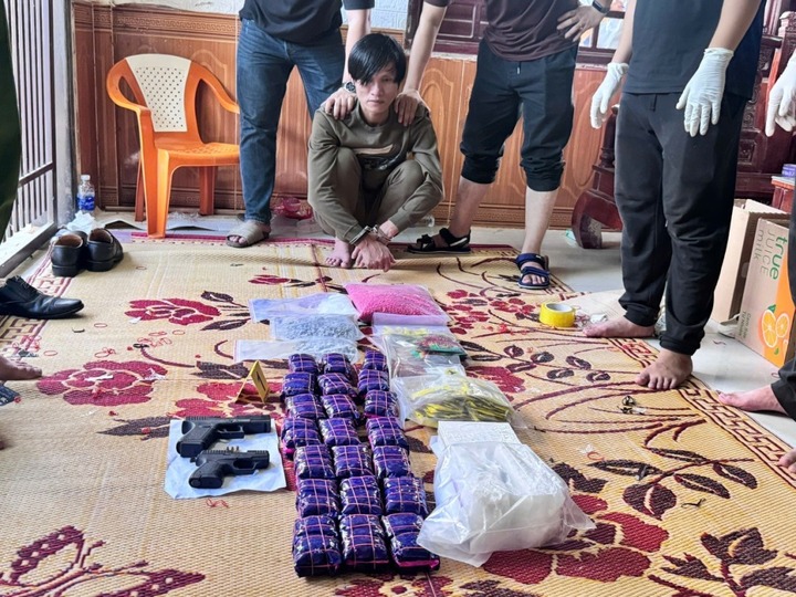 Tổng khối lượng khoảng 14kg ma túy các loại, 02 khẩu súng quân dụng, 03 viên đạn, 02 cân tiểu ly, 01 máy dập, đóng gói bao bì và 02 điện thoại di động.