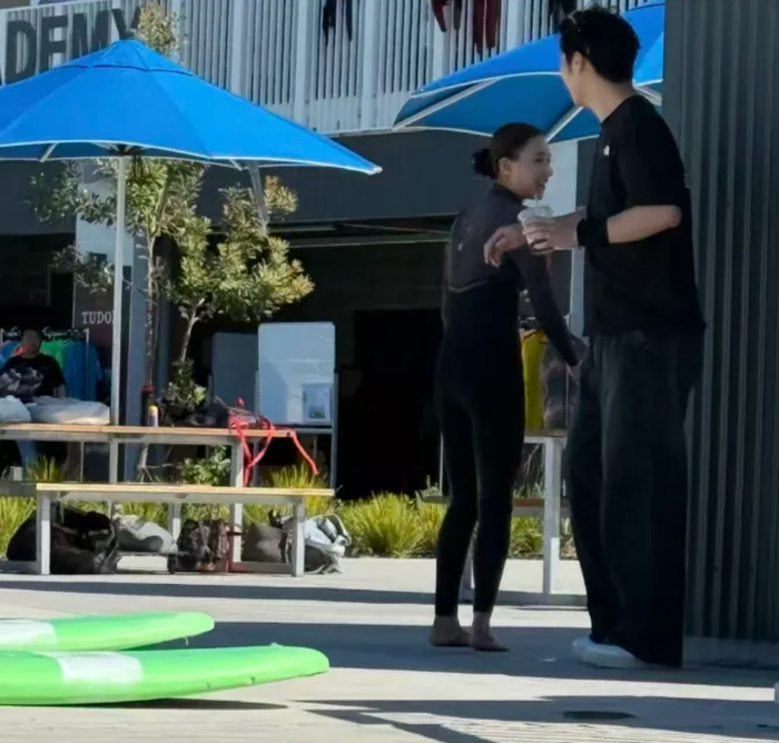 Trong hình ảnh được đăng tải, Đậu Kiêu gây ấn tượng với trang phục thể thao màu đen giản dị, trông khỏe khoắn và phong độ. Trong khi đó, Hà Siêu Liên diện đồ lặn cùng tông màu, khoe nụ cười rạng rỡ khi đứng cạnh chồng. Một khoảnh khắc ghi lại cảnh Đậu Kiêu quay sang nói chuyện khiến vợ bật cười, tạo nên bức ảnh tràn đầy hạnh phúc.