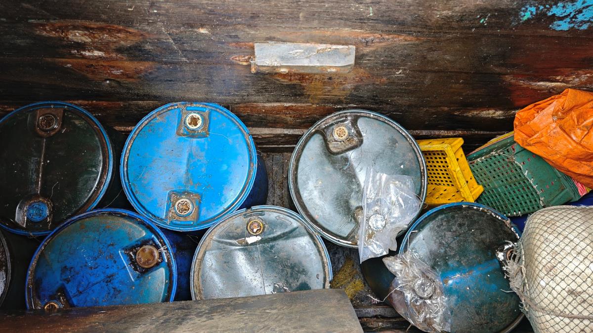 Các thùng phi chứa dầu DO không rõ nguồn gốc trên 2 tàu cá.