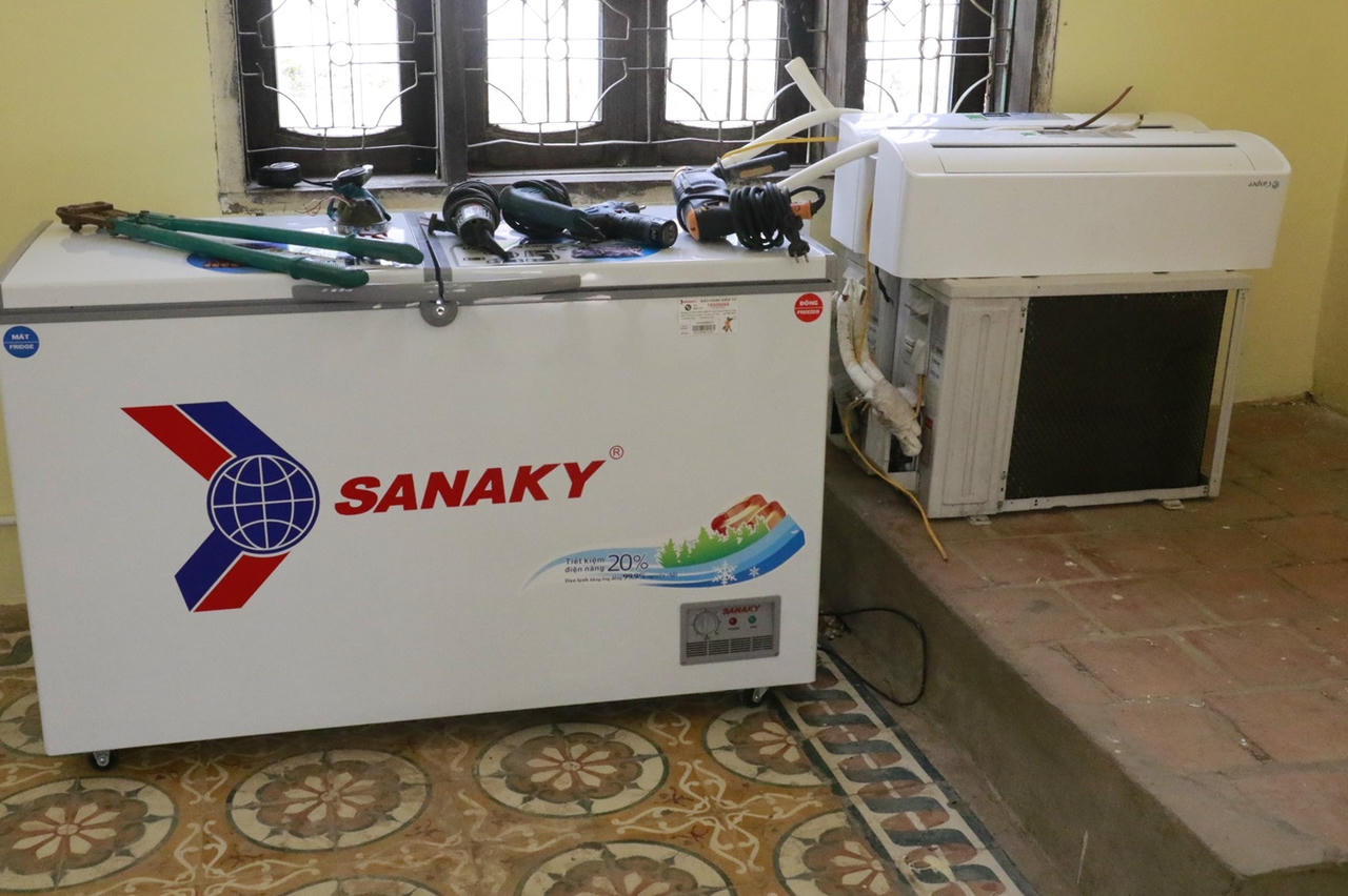 Tài sản sau khi trộm được các đối tượng đưa sang xã khác để cất giấu. Tang vật thu giữ gồm: 2 thuyền, 2 bộ điều hòa, 2 tủ lạnh, 1 máy gặt cùng nhiều tài sản khác, với tổng giá trị trên 100 triệu đồng.