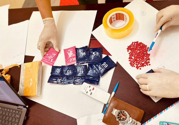 Tang vật thu giữ gồm 1 bánh heroin, 10 túi nilon chứa 2.191 viên nén màu hồng và 20 viên nén màu xanh, qua giám định là ma túy tổng hợp.