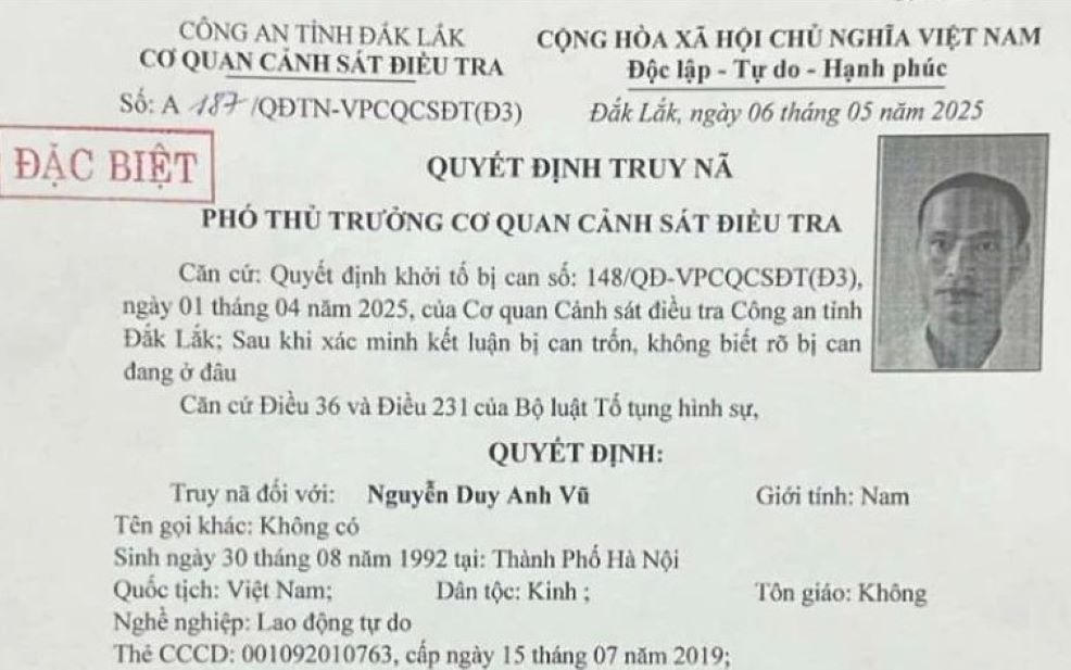 Đến ngày 6/5/2025, Cơ quan CSĐT, Công an tỉnh Đắk Lắk đã ra Quyết định truy nã số A187/QĐTN-VPCQCSĐT đối tượng Nguyễn Duy Anh Vũ về hành vi “Lừa đảo chiếm đoạt tài sản”.