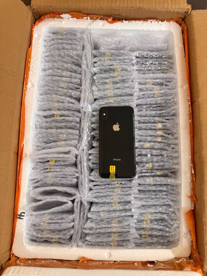 Hàng hóa khai báo là “Quần áo bằng vải tổng hợp xuất xứ Trung Quốc, mới 100%”. Kết quả kiểm tra thực tế phát hiện 2.360 chiếc điện thoại di động nghi vấn đã qua sử dụng các nhãn hiệu iPhone, OPPO, HONOR.