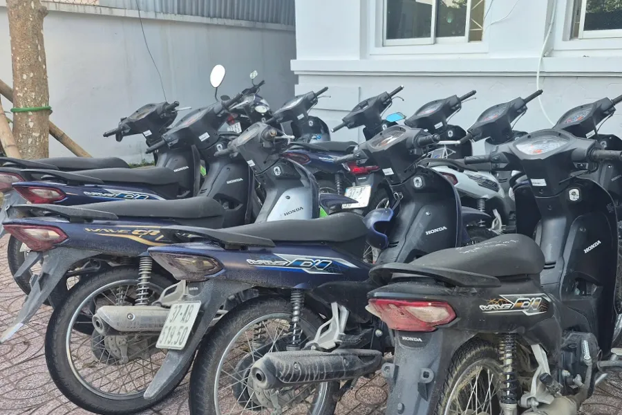 Tang vật thu giữ gồm 12 xe máy, một cờ lê dùng để tháo biển số, bốn biển số xe máy, tám điện thoại di động và nhiều vật liên quan khác.