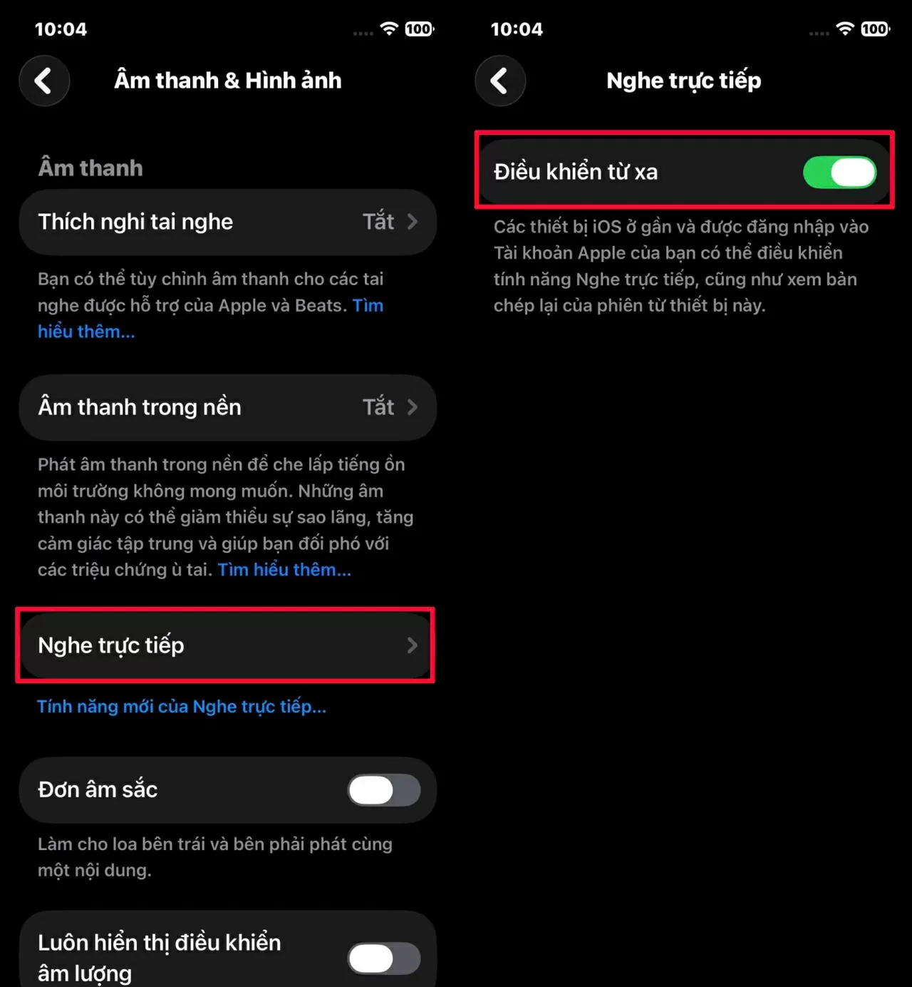 Bước 2: Trong giao diện này, tìm đến mục Nghe trực tiếp (Live Listen) và bật công tắc kích hoạt. Tính năng này sẽ giúp iPhone sử dụng micro của AirPods để thu âm thanh xung quanh, hỗ trợ quá trình ghi hình được rõ ràng hơn.