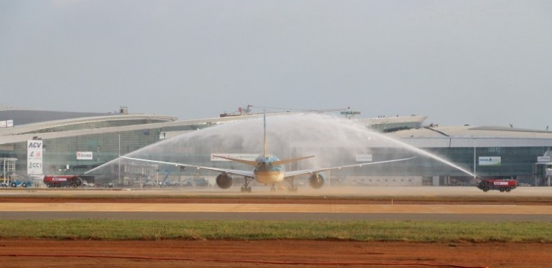 Khi hạ cánh, máy bay được xe dẫn đường đưa theo vệt lăn D24, di chuyển qua khu vực xe cứu hỏa phun nước chào mừng trước khi vào sân đỗ. Ảnh: Tập chí hàng không