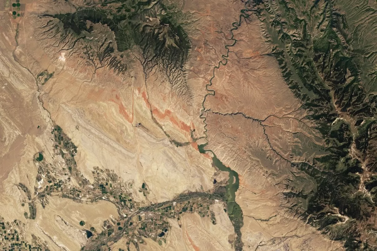 Đài quan sát Trái đất của NASA cho thấy các nếp gấp của đá gỉ sét nằm cạnh hẻm núi Bighorn giữa Wyoming và Montana. (Nguồn: NASA)