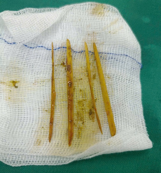Hình ảnh các que tăm được ê kip phẫu thuật lấy ra. Ảnh: BVCC.