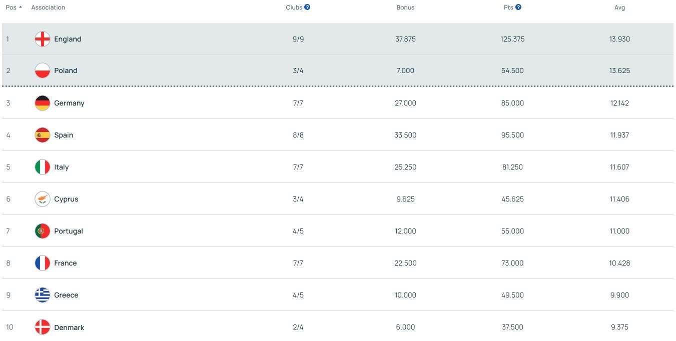 Dù vậy, khả năng Ba Lan giữ được vị trí thứ hai đến cuối mùa là rất mong manh. Đức và Tây Ban Nha đang bám sát với nhiều đại diện còn góp mặt ở Champions League và Europa League. Tuy nhiên, việc Ba Lan tạm thời đứng thứ hai ở giai đoạn này vẫn là bất ngờ rất lớn.