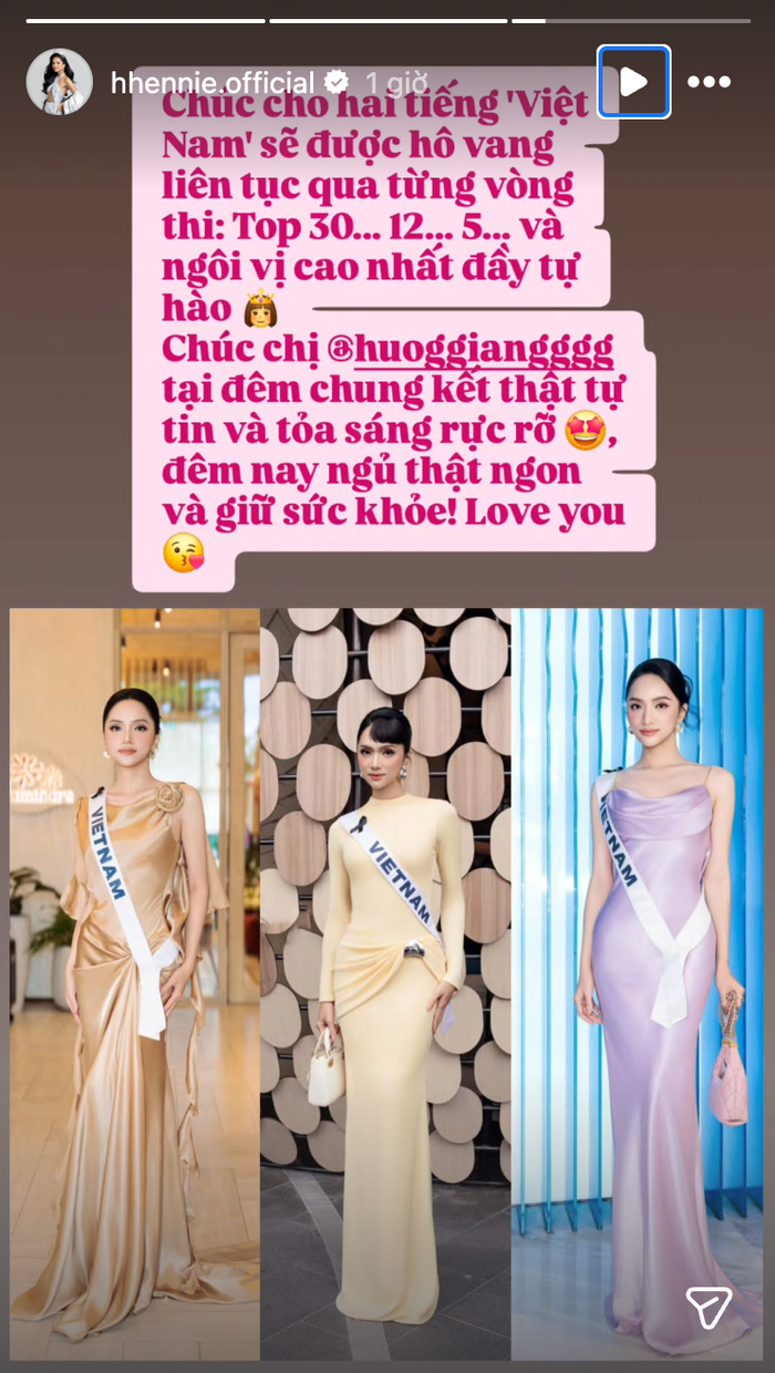 Giữa lúc người hâm mộ đang nóng lòng chờ đợi, H'Hen Niê gây bất ngờ khi công khai gửi lời chúc đến Hương Giang. Trên trang cá nhân, nàng hậu viết: “Chúc cho hai tiếng Việt Nam sẽ được hô vang qua từng vòng thi: top 30, 12, 5... và ngôi vị cao nhất đầy tự hào. Chúc chị Hương Giang tại đêm chung kết thật tự tin và tỏa sáng rực rỡ”. Không dừng lại ở đó, H'Hen Niê còn nhắn nhủ đàn chị hãy ngủ đủ giấc, giữ gìn sức khỏe để hoàn thành thật tốt phần thi quan trọng nhất.