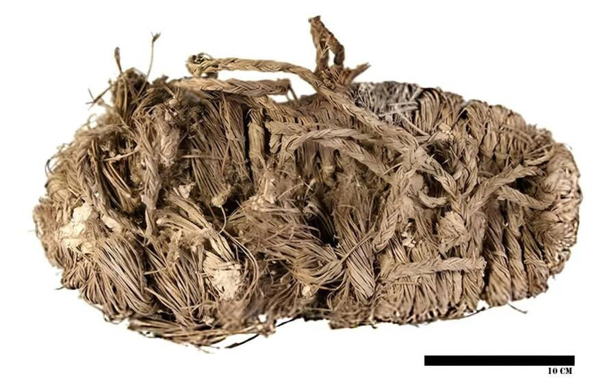 Một hiện vật đáng chú ý tìm thấy trong tổ chim là chiếc dép hoàn chỉnh có niên đại ít nhất 650 năm tuổi. Đôi dép được người xưa làm từ cỏ và cành cây. Ảnh: ntonia Margalida/Sergio Couto; modified by IFLScience.