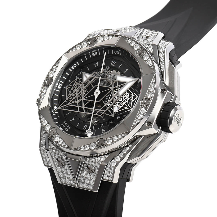 Trong suốt lễ cưới, chồng Đỗ Thị Hà - doanh nhân Nguyễn Viết Vương - đã đeo chiếc Hublot Big Bang Sang Bleu II Titanium Pavé dây đen, một biểu tượng xa xỉ trị giá hơn 1 tỷ đồng (khoảng 48.200 USD). Chiếc đồng hồ này toát lên vẻ sang trọng đỉnh cao nhờ vỏ titanium 45mm bền nhẹ, được đánh bóng satin và đính dày đặc 172 viên kim cương pavé lấp lánh, kết hợp bezel lục giác với 48 viên kim cương khác.