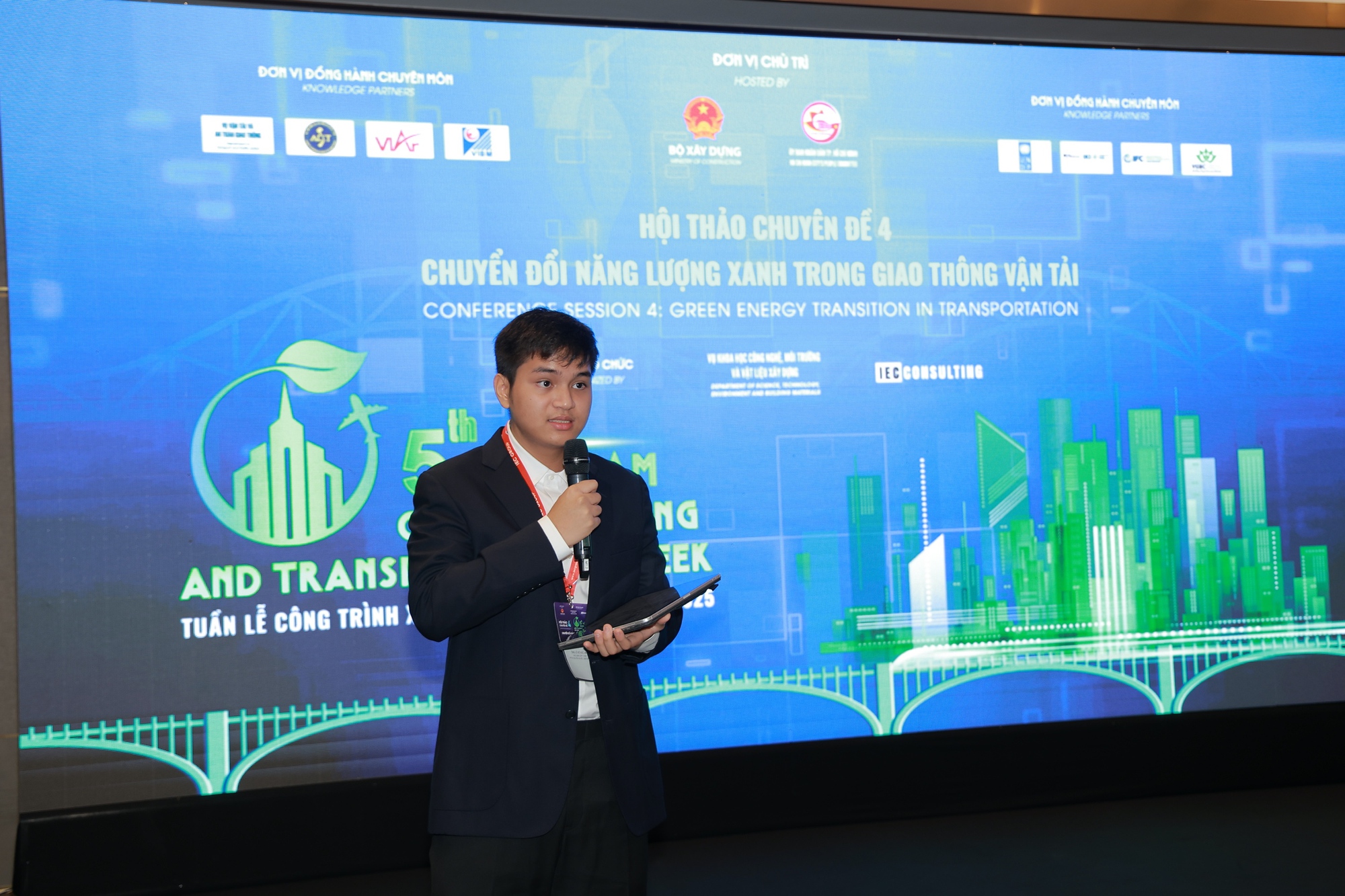 Lê Đỗ Đức Anh, học sinh Trường THPT chuyên Hà Nội – Amsterdam, đã trình bày tham luận "Hành trình Zero Carbon – Giao thông xanh học đường".
