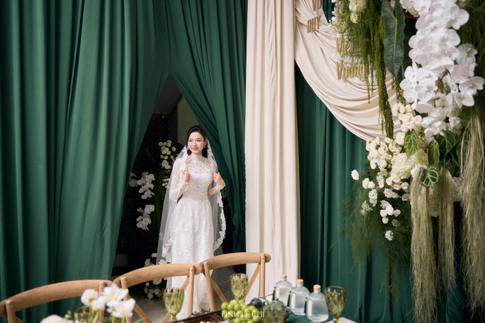 Trong khi đó, Đỗ Thị Hà lựa chọn áo dài trắng đơn giản, trang điểm nhẹ nhàng nhưng vẫn toát lên vẻ rạng rỡ và nền nã của một cô dâu sắp về nhà chồng.