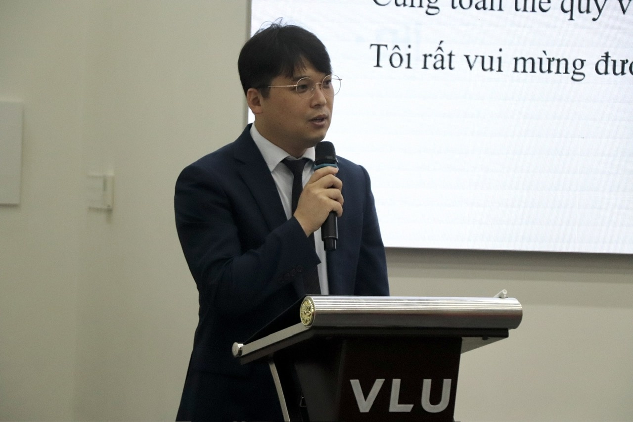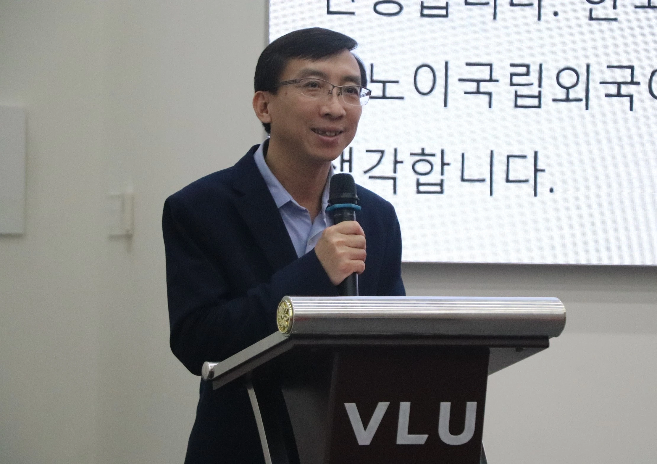 GS.TS Võ Nguyễn Quốc Bảo thông tin về hoạt động giảng dạy tiếng Hàn tại TP.HCM nói riêng và khu vực miền Nam nói chung. Ảnh: Thái An.