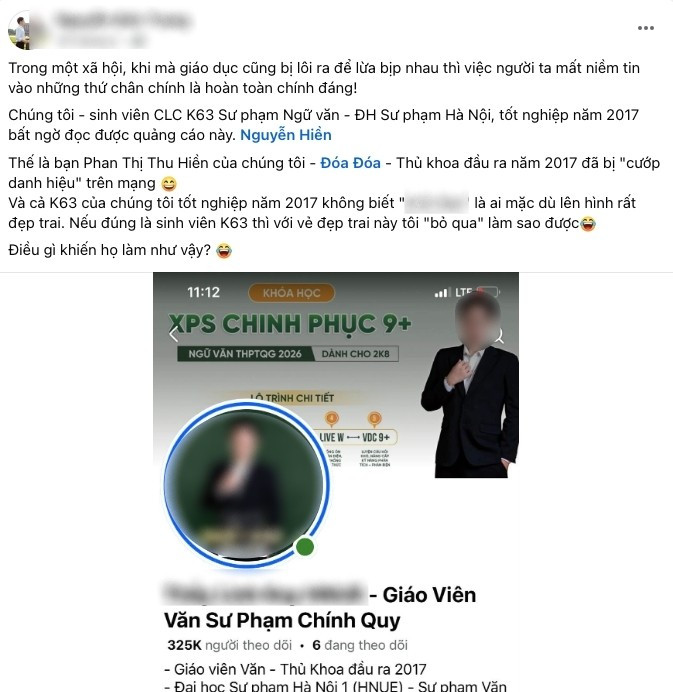 Bên cạnh rủi ro về sai lệch kiến thức, tính minh bạch trong bằng cấp của người dạy online cũng đang là một dấu hỏi lớn. Cụ thể, một người dạy Ngữ văn sở hữu trang cá nhân hơn 300.000 lượt theo dõi từng giới thiệu bản thân là Thủ khoa đầu ra năm 2017 của Trường Đại học Sư phạm Hà Nội. Tuy nhiên, một cựu sinh viên cùng khóa đã đăng tải bài viết phản ánh cho thấy danh hiệu này thực chất thuộc về một người khác. Điều này cũng trùng khớp với các thông tin vinh danh thủ khoa đã được báo chí đăng tải vào thời điểm đó. Sau khi bài phản ánh thu hút lượng lớn tương tác, người dạy nói trên đã nhiều lần âm thầm chỉnh sửa thông tin giới thiệu cá nhân nhưng đến nay vẫn chưa đưa ra bất kỳ phản hồi chính thức nào.