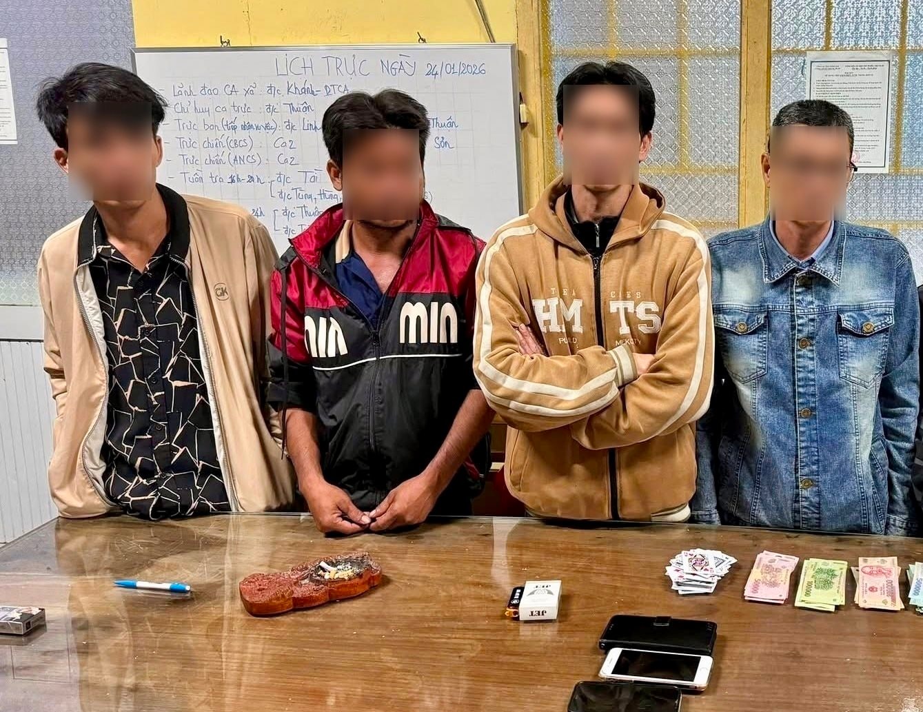 Bốn người đàn ông cùng tang vật tại chiếu bạc