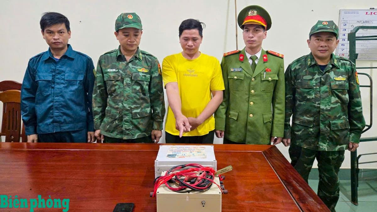 Đồn Biên phòng cửa khẩu cảng Cửa Việt phối hợp với Công an xã Bến Hải lập biên bản, tạm giữ đối tượng cùng bộ dụng cụ kích điện dùng để khai thác thủy sản trái phép. Ảnh: Anh Quân