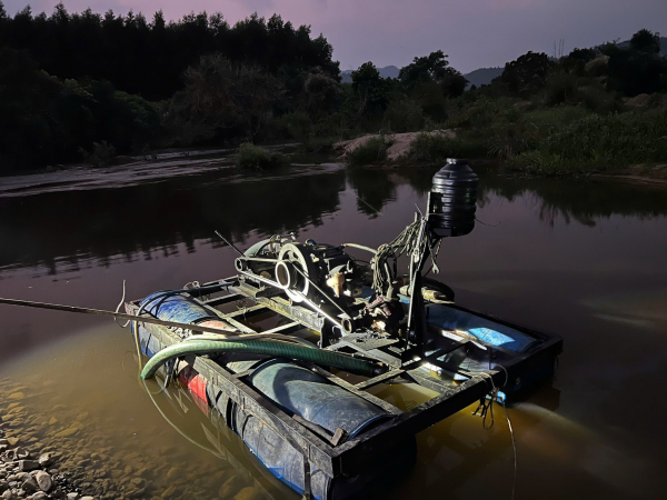 Tại hiện trường, ngoài chiếc phà tự chế có gắn máy nổ đang hút cát dưới lòng sông, bên bờ sông còn có 3 xe ô tô tải ben vận chuyển cát. Tại thời điểm kiểm tra, các đối tượng khai nhận không có giấy phép khai thác, vận chuyển khoáng sản.