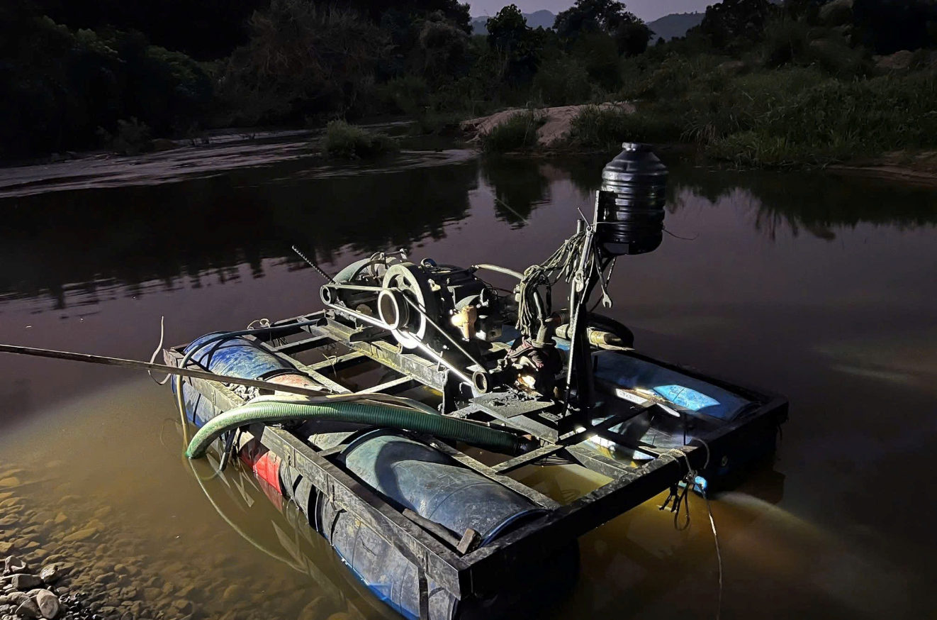 Trước đó, tối 11/4, trong quá trình tuần tra theo kế hoạch cao điểm kiểm soát hoạt động khoáng sản, lực lượng công an phát hiện một nhóm đối tượng sử dụng phà máy tự chế để bơm hút cát trái phép tại khu vực sông Chò, thuộc thôn Ba Cẳng.