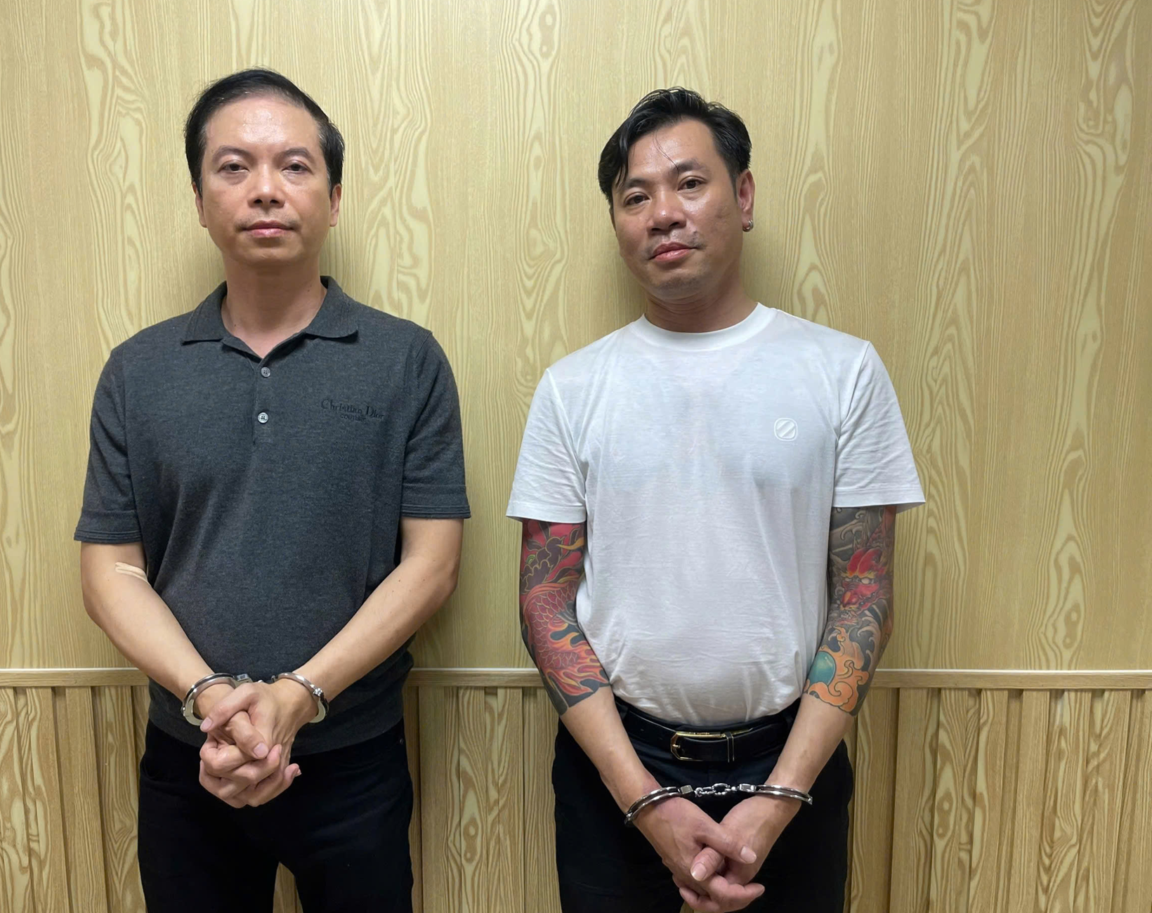 Mã Thanh (trái) - tài xế xe Bentley và Ngô Duy Đông tại cơ quan công an. (Ảnh: CACC)