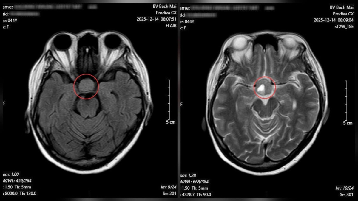 Từ những dấu hiệu trên, bệnh nhân được chỉ định chụp cộng hưởng từ (MRI) sọ não. Kết quả cho thấy một khối u tuyến yên kích thước lớn (macroadenoma), kích thước 26 × 21 mm.