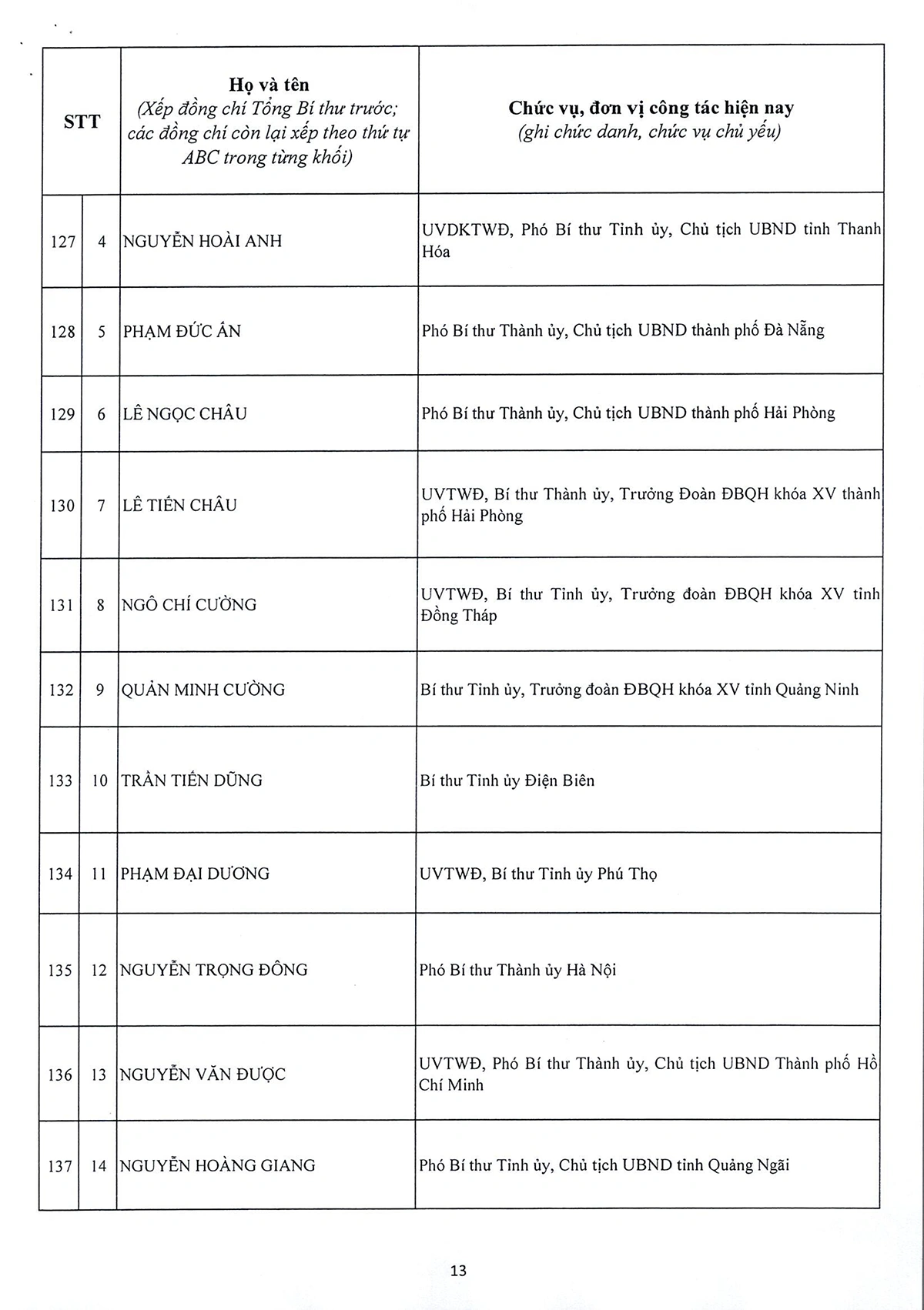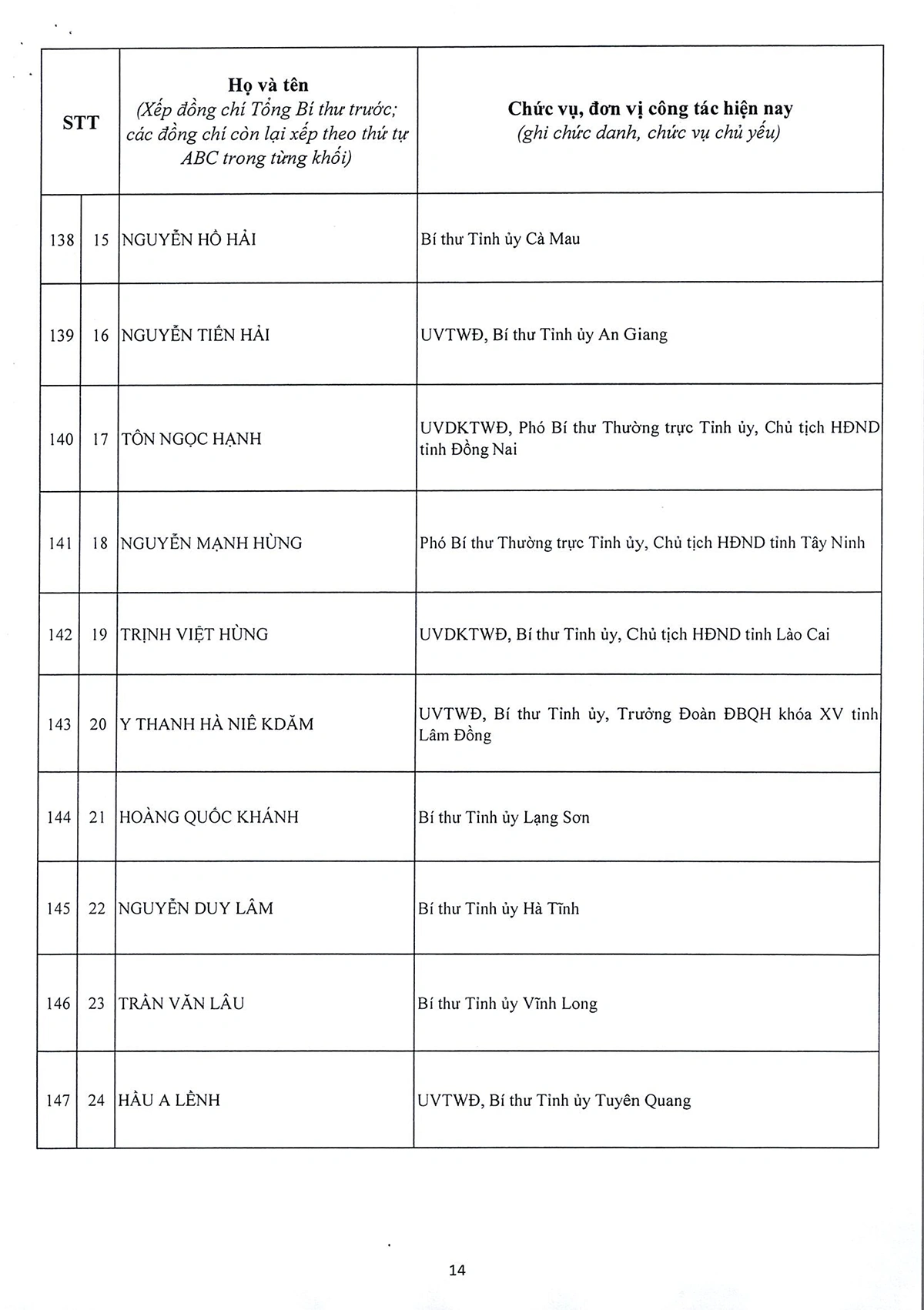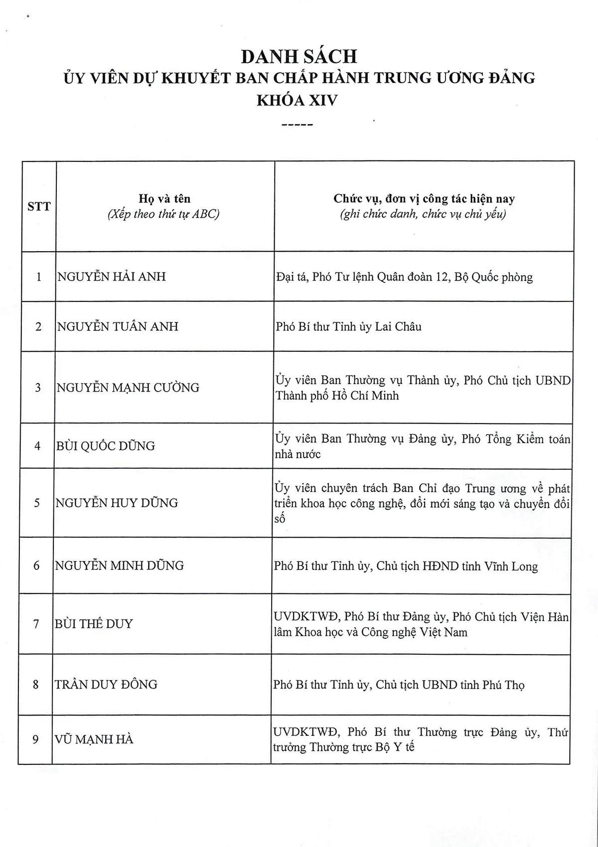 DANH SÁCH 20 ĐỒNG CHÍ ỦY VIÊN DỰ KHUYẾT BAN CHẤP HÀNH TRUNG ƯƠNG ĐẢNG KHÓA XIV