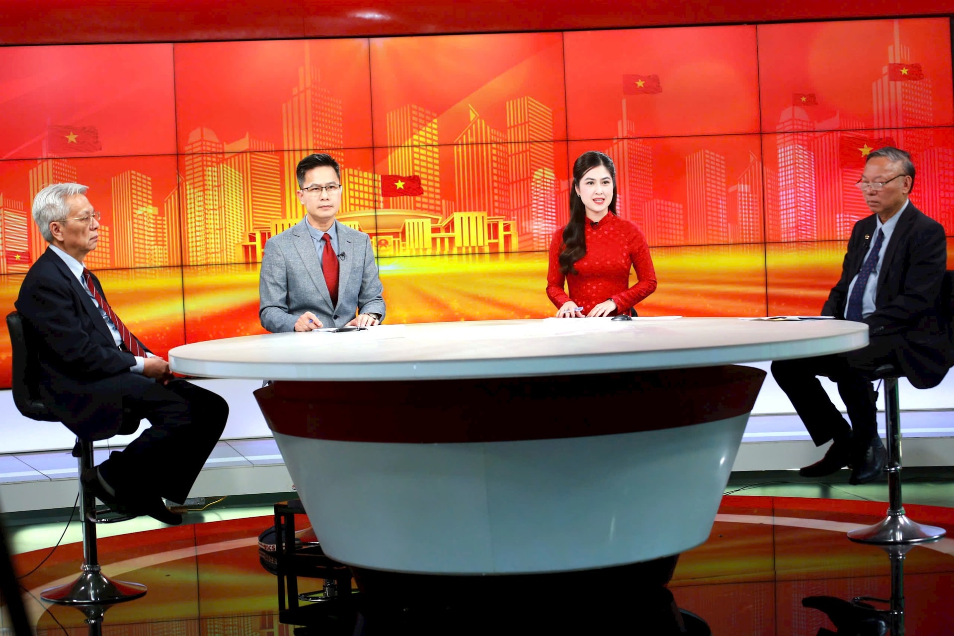 Giáo sư Nguyễn Quang Ngọc và Tiến sĩ Nguyễn Sỹ Dũng trao đổi tại chương trình thời sự đặc biệt với chủ đề “Xây dựng Nhà nước pháp quyền, phát huy quyền làm chủ của nhân dân” do Cơ quan Báo và Phát thanh, truyền hình Hà Nội thực hiện, tối 10-3. Ảnh Phạm Hùng
