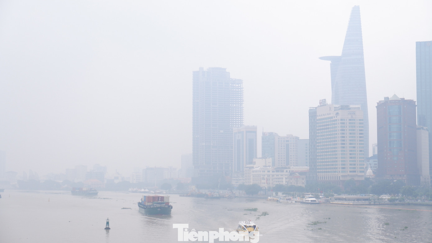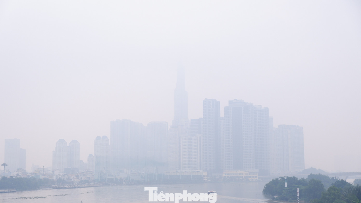 Theo Air Visual, nồng độ bụi mịn PM 2.5 tại TPHCM vào sáng 11/10 cao gấp 15 lần giá trị theo hướng dẫn về chất lượng không khí hàng năm của WHO. Trong ảnh: Nhìn từ xa, tòa nhà Bitexco các tòa nhà cao tầng ở trung tâm TPHCM bị che phủ bởi lớp sương mờ.