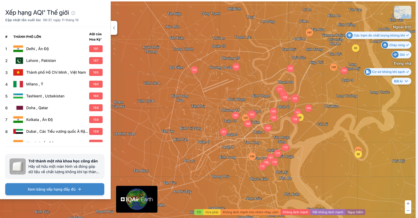 Theo ứng dụng quan trắc không khí Air Visual (thuộc Tổ chức IQAir sở hữu lượng dữ liệu tổng hợp rất lớn về chất lượng không khí, có trụ sở chính tại Thụy Sỹ), sáng 11/10, nhiều khu vực tại TPHCM có điểm đo chất lượng không khí (mức màu đỏ) không tốt cho sức khỏe.