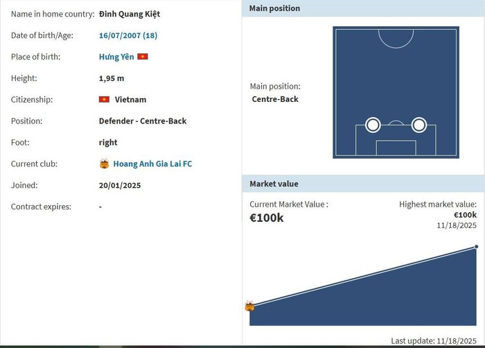 Transfermarkt cũng đưa ra hai con số rất đáng chú ý: Đinh Quang Kiệt đã có 22 trận thi đấu chuyên nghiệp cho HAGL và được định giá 100.000 euro (khoảng 2,3 tỷ đồng) vào tháng 11/2025, cao gấp bốn lần so với mức 25.000 euro hồi tháng 6/2025. Dù chưa có bản cập nhật mới nhất, nhưng với việc liên tục đá chính và thể hiện phong độ ổn định, giá trị của Quang Kiệt được dự đoán sẽ còn tiếp tục tăng.