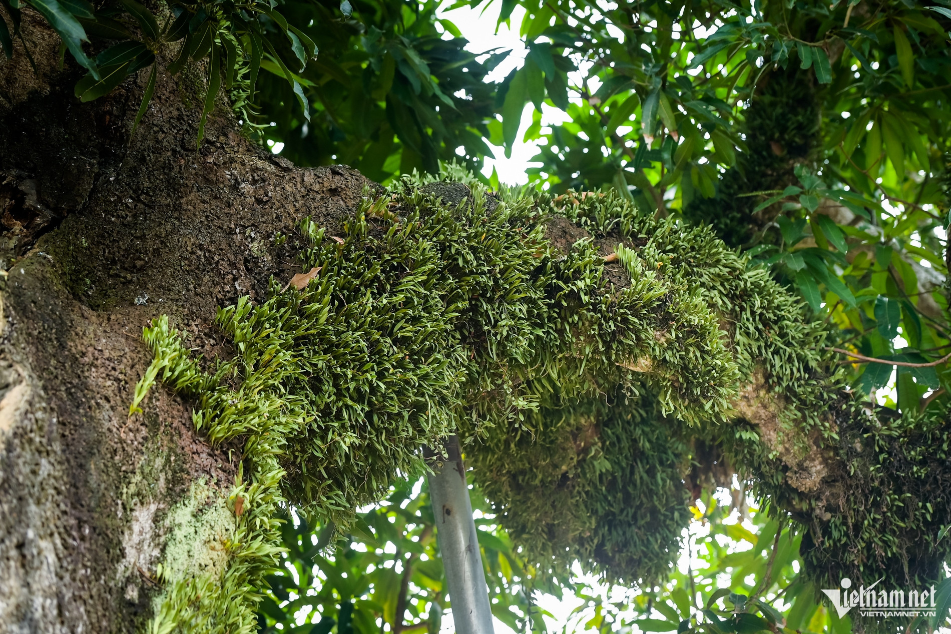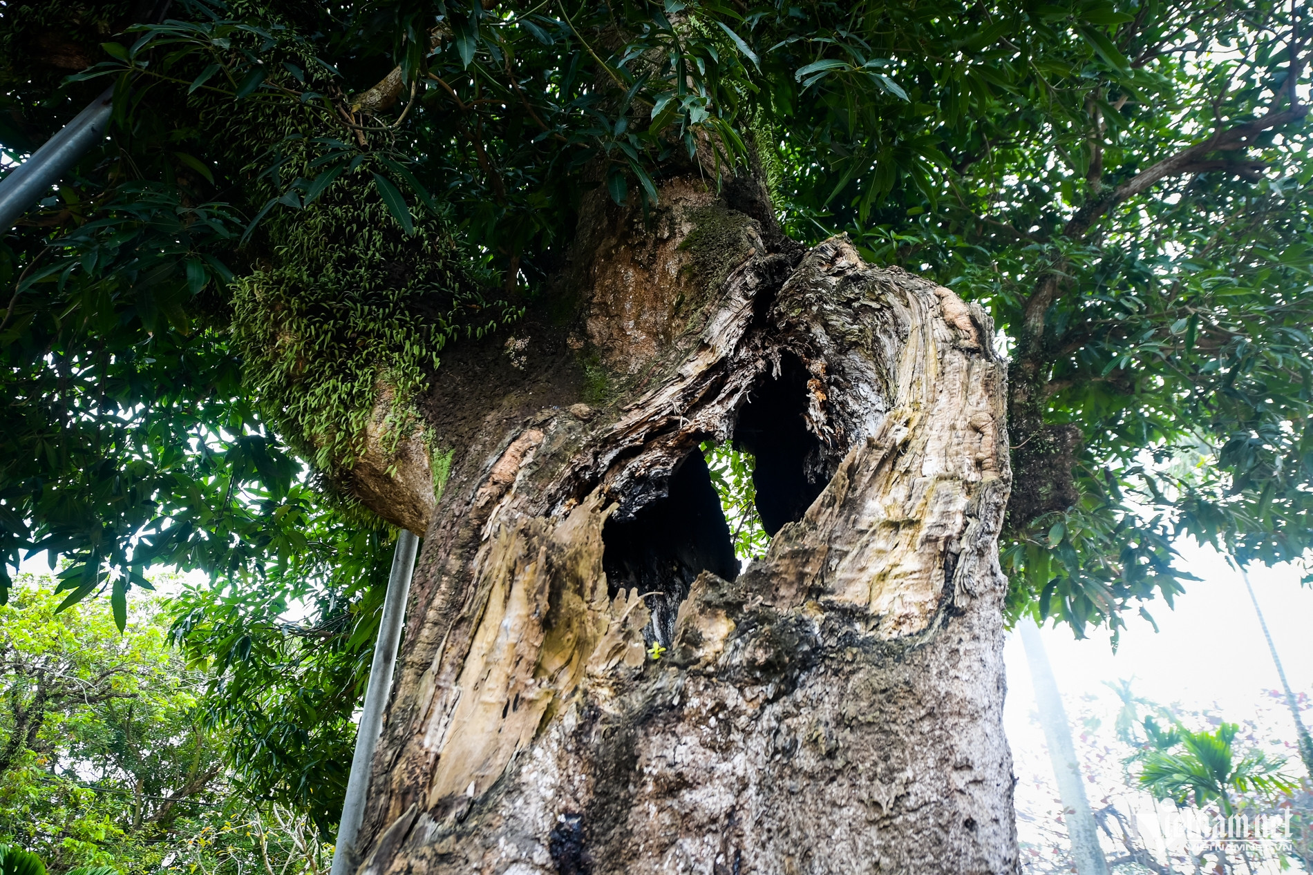 Thân cây sần sùi, mang vết tích của thời gian, trên nhiều cành có cây tầm gửi bám chắc.