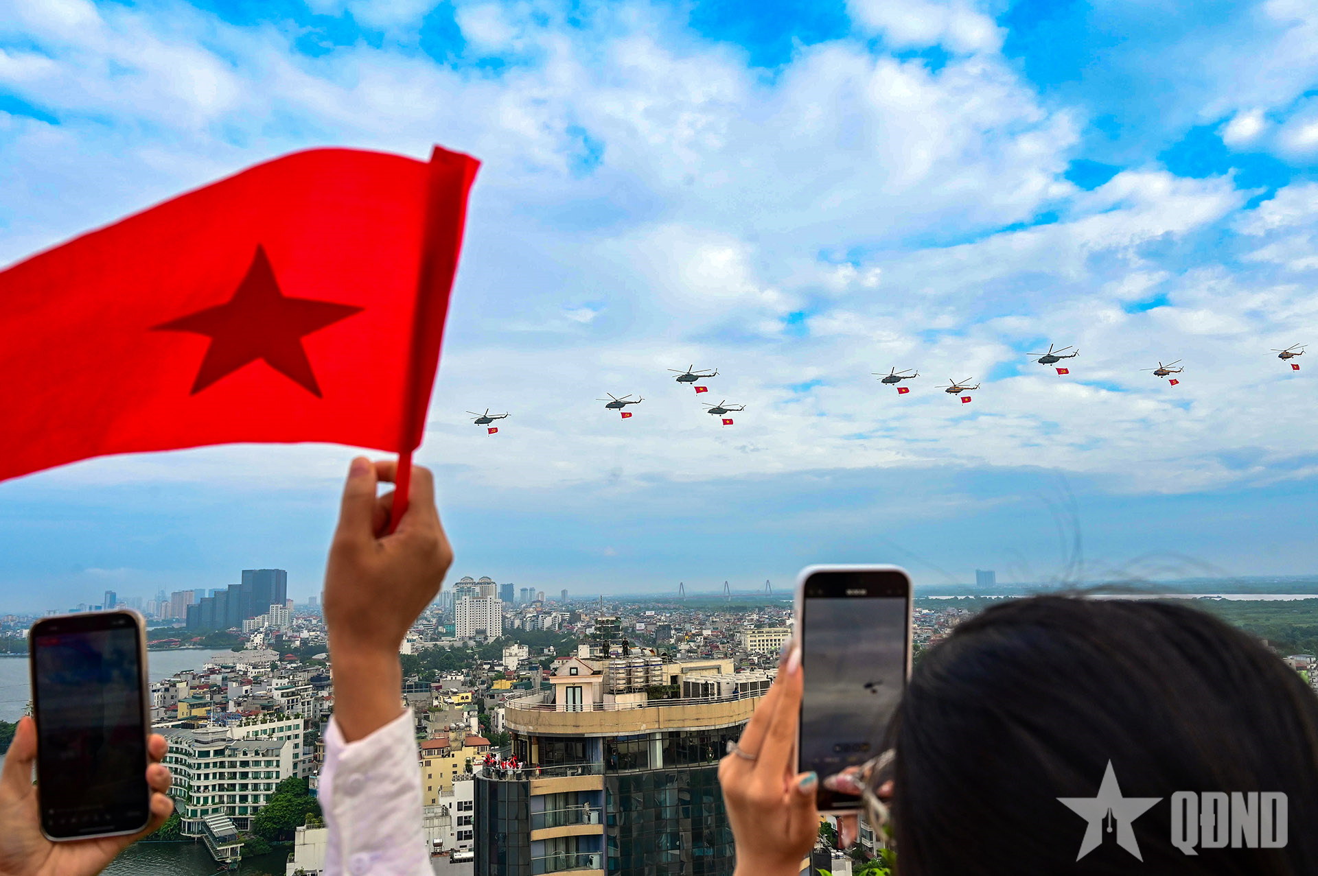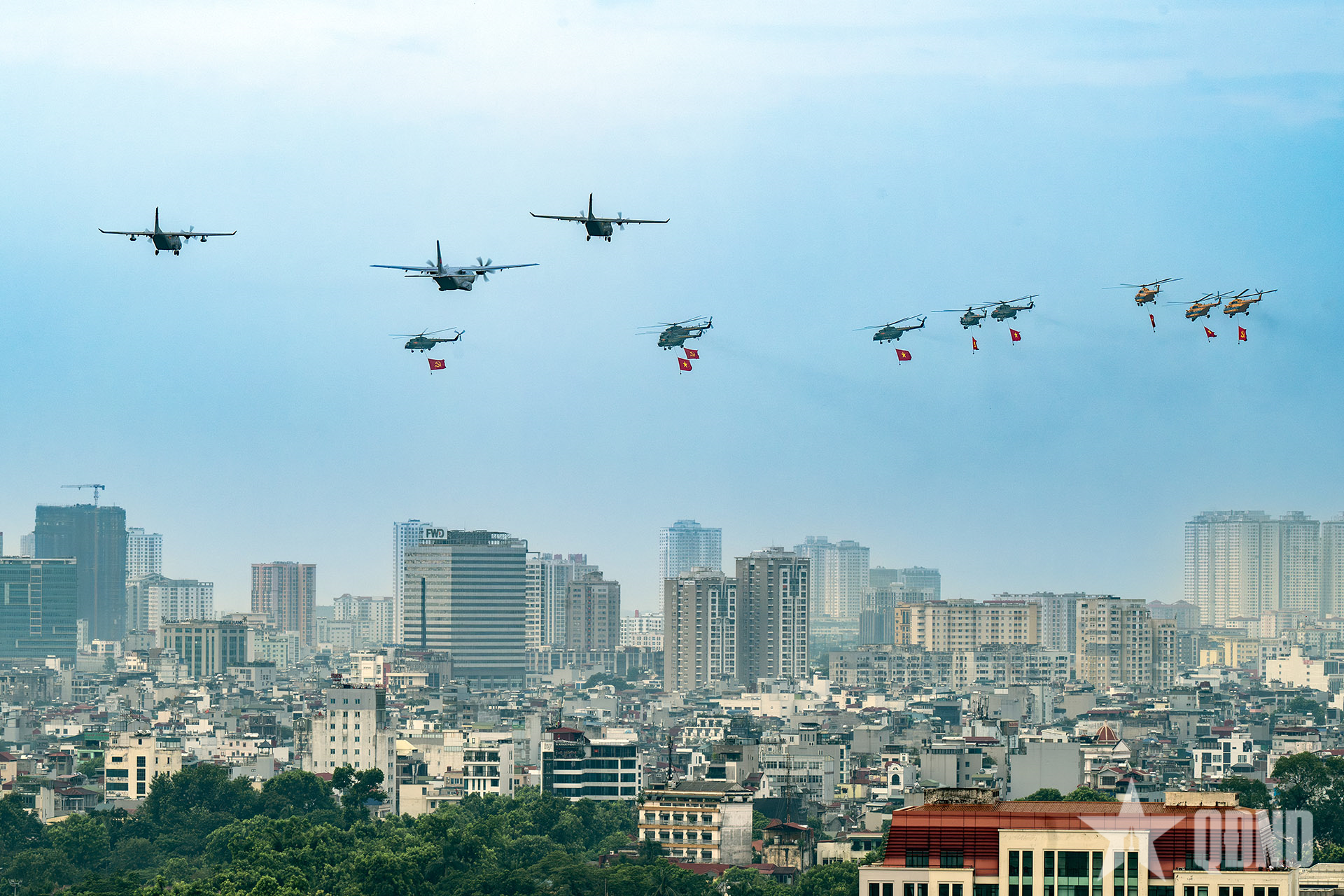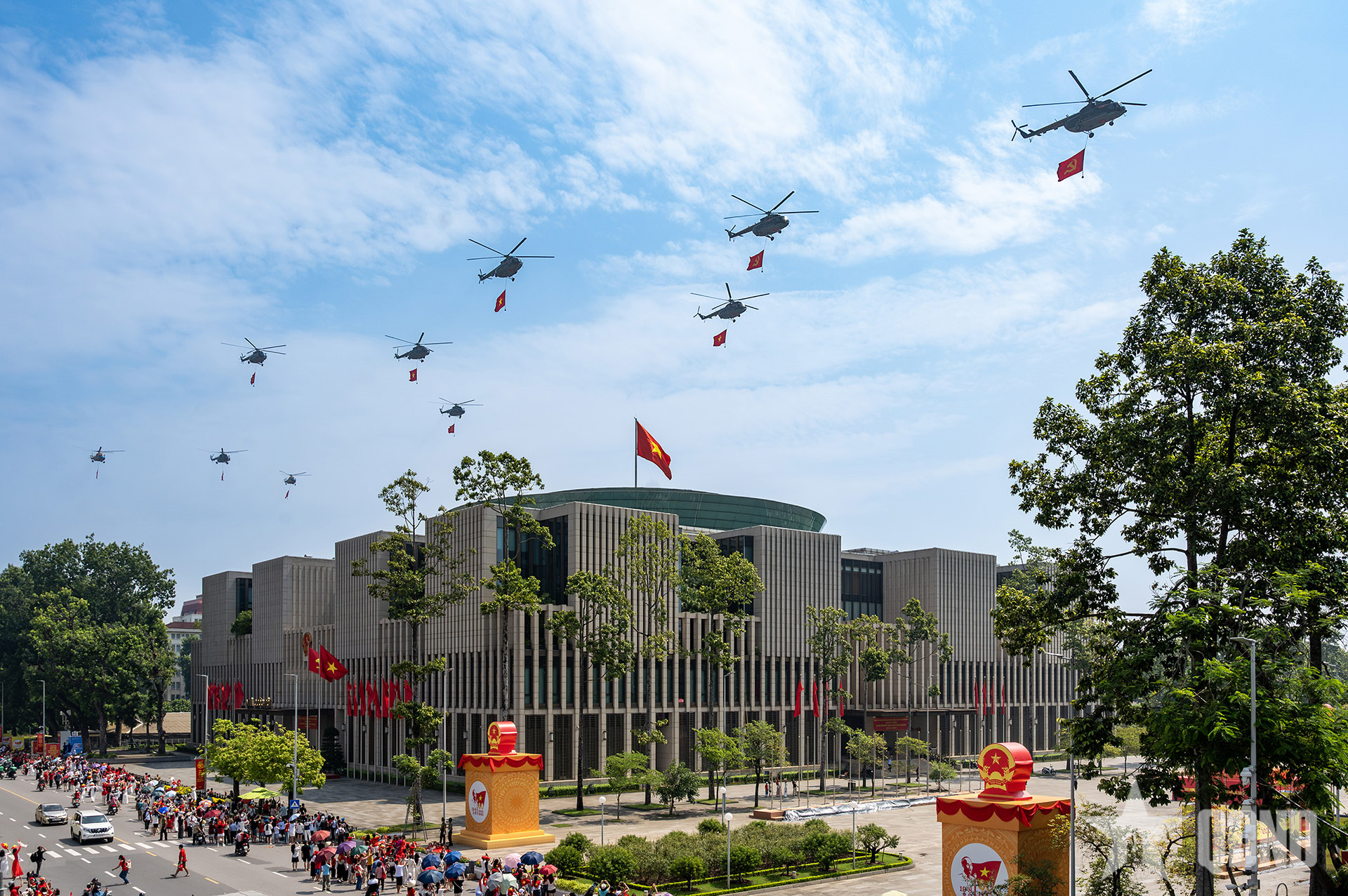 Các biên đội trực thăng luyện tập bay treo cờ Đảng và cờ Tổ quốc ngang qua Quảng trường Ba Đình (Hà Nội).
