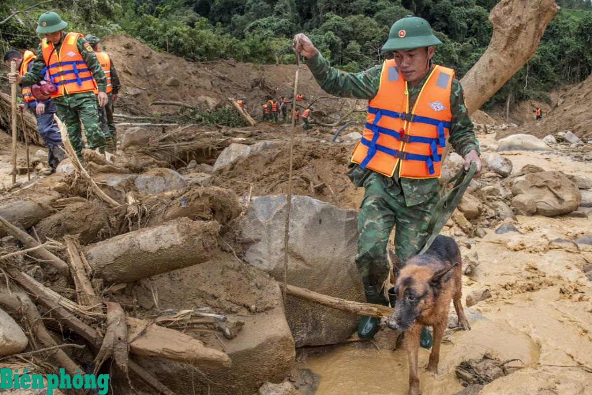 Huấn luyện viên và chó nghiệp vụ của Trường Trung cấp 24 Biên phòng tham gia tìm kiếm nạn nhân mất tích tại xã Hùng Sơn, thành phố Đà Nẵng. Ảnh: Văn Chương