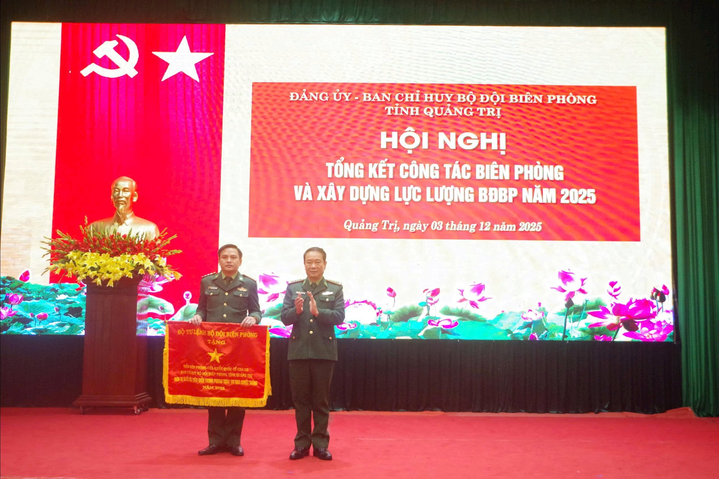 Thừa ủy quyền của Bộ Tư lệnh BĐBP, Đại tá Trịnh Thanh Bình, Chỉ huy trưởng Ban Chỉ huy BĐBP tỉnh trao Cờ thi đua cho tập thể Đồn Biên phòng Cửa khẩu Quốc tế Cha Lo