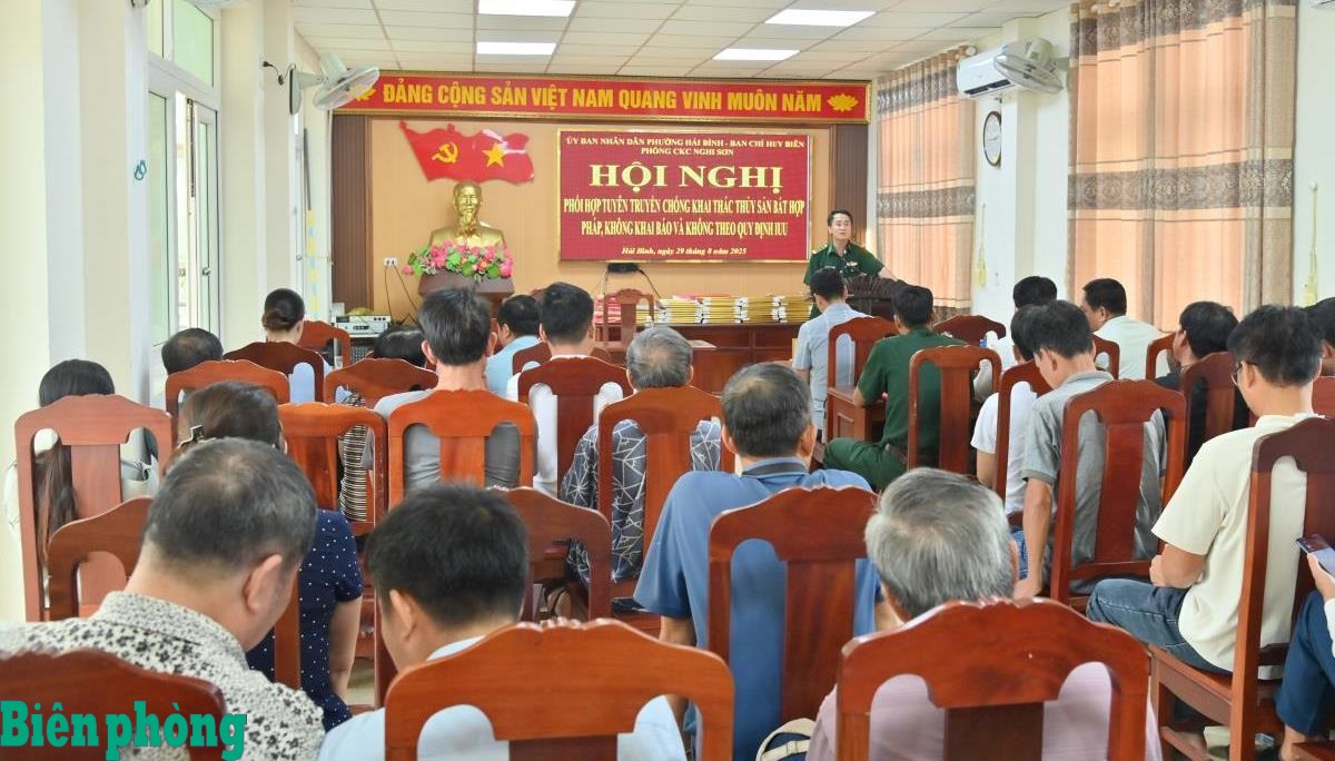 Ban Chỉ huy Biên phòng cửa khẩu cảng Nghi Sơn, BĐBP tỉnh Thanh Hóa phối hợp với cấp ủy, chính quyền phường Hải Bình tổ chức tuyên truyền về phòng, chống khai thác IUU cho người dân địa phương. Ảnh: Hải Chuyền
