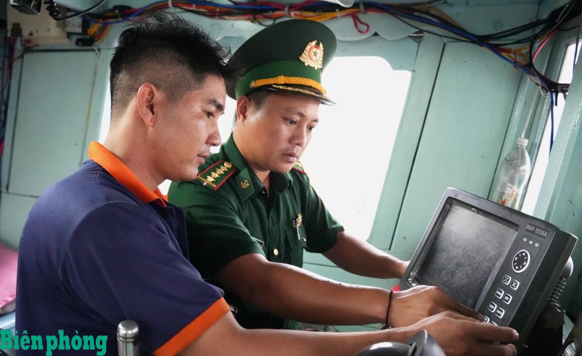 Cán bộ Hải đội Biên phòng 1, BĐBP tỉnh Cà Mau tiếp cận tàu cá, kiểm tra nhật ký khai thác và thiết bị giám sát hành trình theo quy định. Ảnh: Hoàng Tá