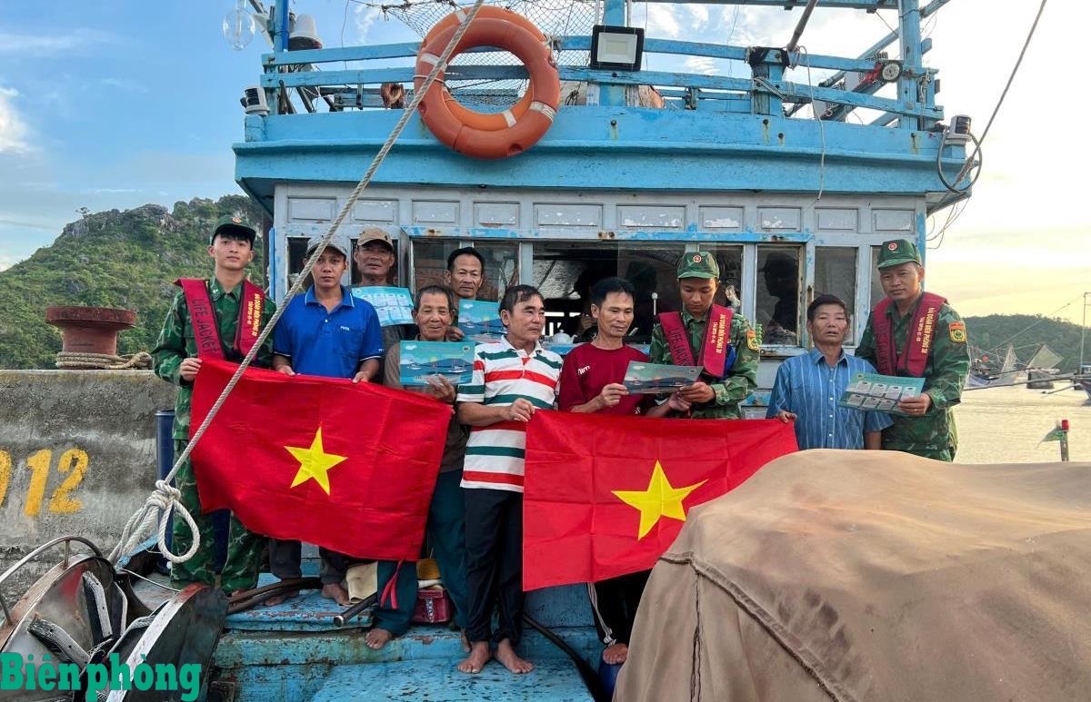 Cán bộ Hải đoàn Biên phòng 38 tặng cờ Tổ quốc, phát tờ rơi tuyên truyền và giải đáp thắc mắc của ngư dân về các quy định của pháp luật trong khai thác hải sản. Ảnh: Văn Vinh