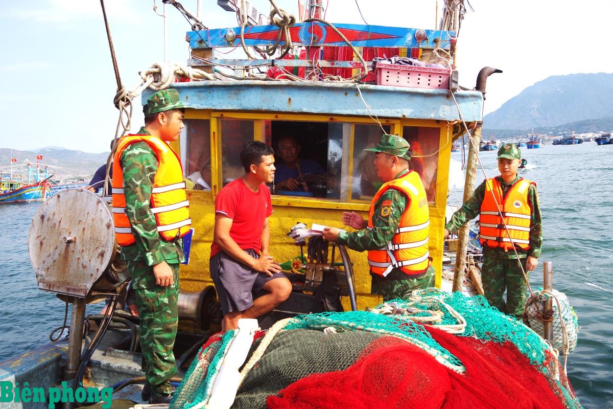Cán bộ BĐBP tỉnh Khánh Hòa đến từng tàu cá tại khu neo đậu để tuyên truyền quy định về chống khai thác IUU, hướng dẫn thuyền trưởng thực hiện đúng thủ tục trước khi ra khơi. Ảnh: Văn Tân