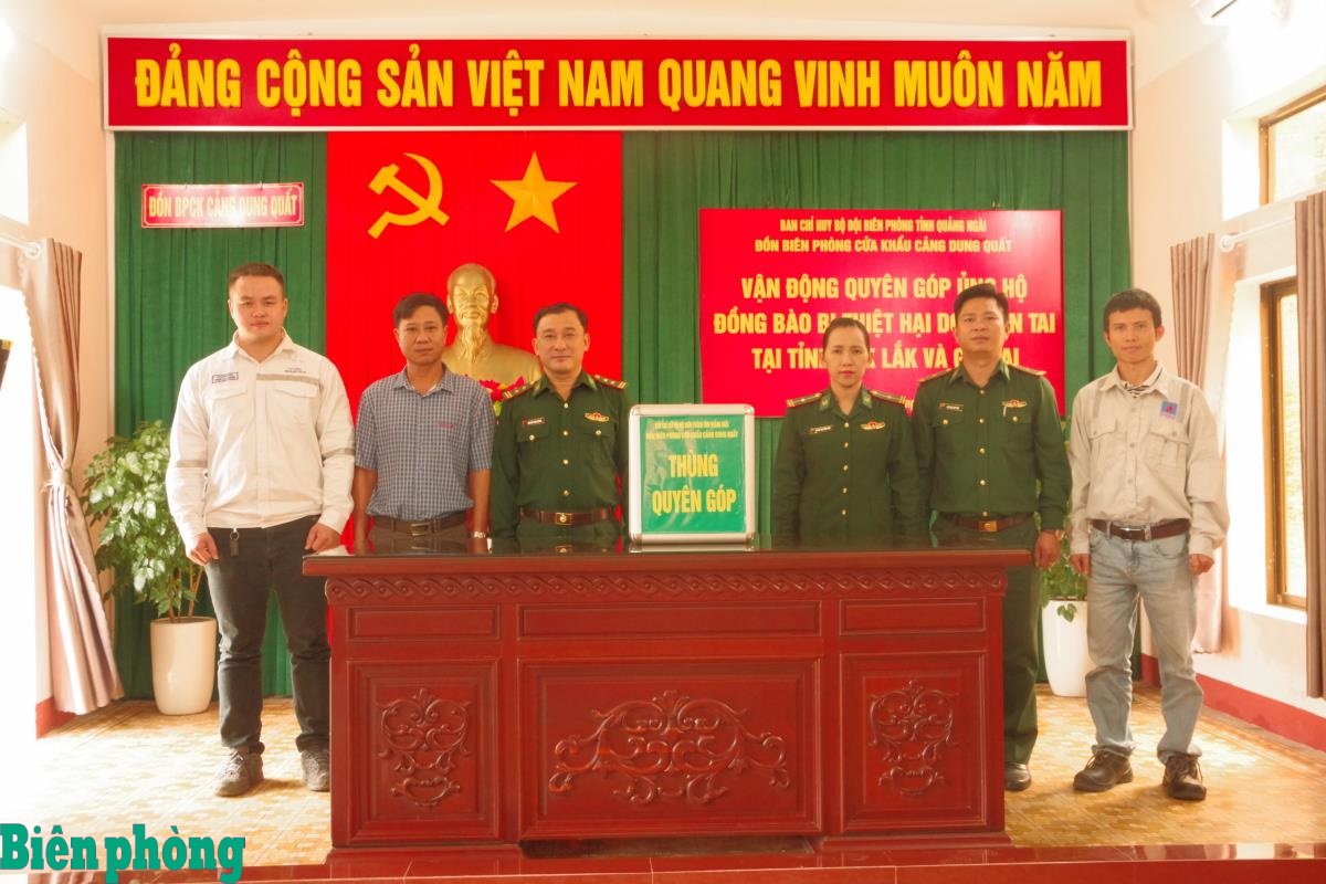 Sẻ chia trước những mất mát, đau thương của đồng bào các tỉnh Nam Trung bộ, Đồn Biên phòng cửa khẩu cảng Dung Quất đã vận động cán bộ, chiến sĩ và các mạnh thường quân chung tay hỗ trợ nhân dân các tỉnh bị thiệt hại. Buổi vận động đã thu được số tiền 120 triệu đồng. Trung tá Nguyễn Tùng Dương, Đồn trưởng Đồn Biên phòng cửa khẩu cảng Dung Quất chia sẻ: “Chúng tôi vận động cán bộ, chiến sĩ được 20 triệu đồng, phần còn lại thì do các doanh nghiệp trên địa bàn đơn vị đóng quân chung tay ủng hộ. Số tiền này chúng tôi sẽ nhanh chóng chuyển đến tay người dân trong lúc họ khó khăn nhất”.