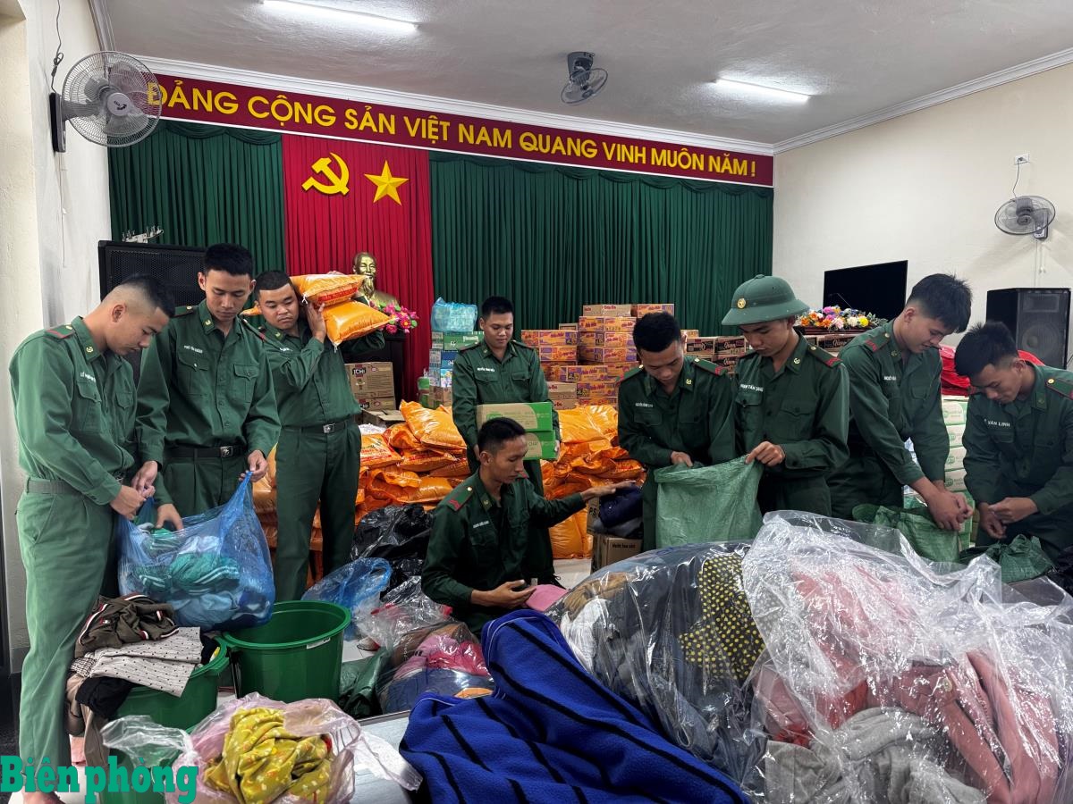 Cán bộ, chiến sĩ Đồn Biên phòng cửa khẩu cảng Sa Kỳ phân loại quần áo gửi đồng bào vùng lũ lụt. Ảnh: Văn Tánh