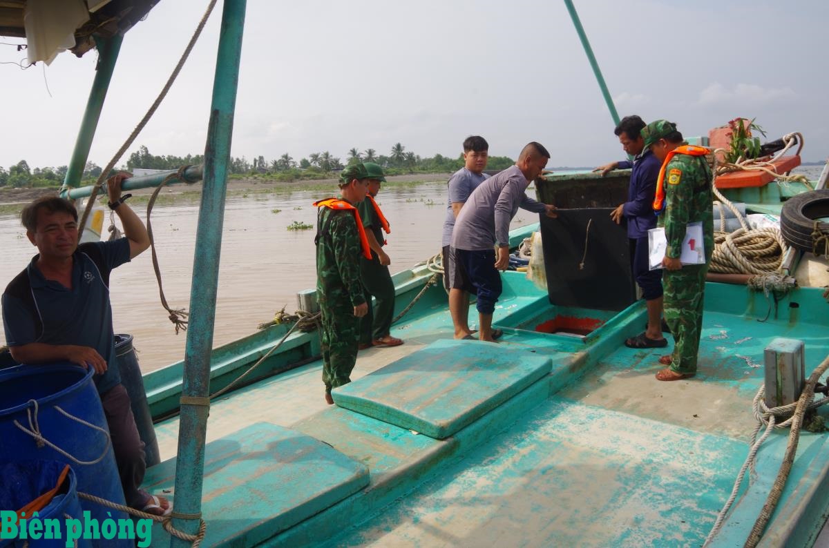 Lực lượng chức năng BĐBP tỉnh Vĩnh Long kiểm tra tàu cá VL-95096-TS vận chuyển dầu trái phép. Ảnh: Sa Rây