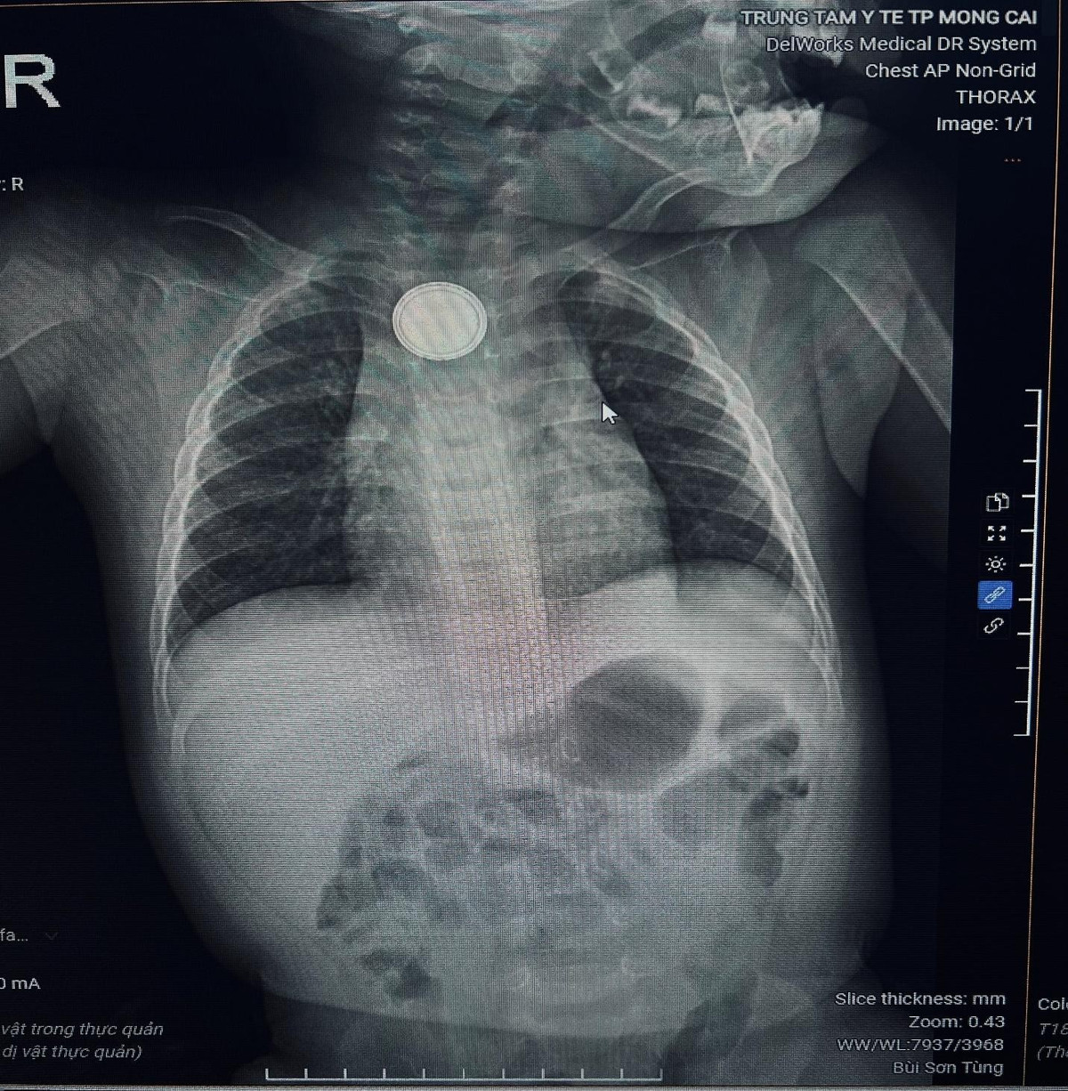 Trung tâm Y tế Móng Cái (Quảng Ninh) vừa tiếp nhận cấp cứu bệnh nhi B.M.K. (11 tháng tuổi) nhập viện trong tình trạng nôn nhiều, quấy khóc dữ dội. Qua thăm khám và chụp X-quang, các bác sĩ phát hiện dị vật kim loại hình tròn mắc kẹt tại thực quản.