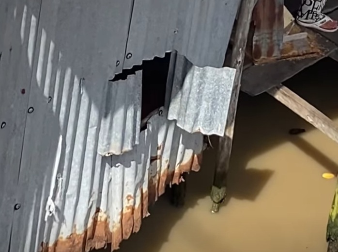 Lỗ trống trên vách căn nhà sàn của gia đình bà K. là điểm nghi ngờ bé trai bị lọt xuống sông mất tích