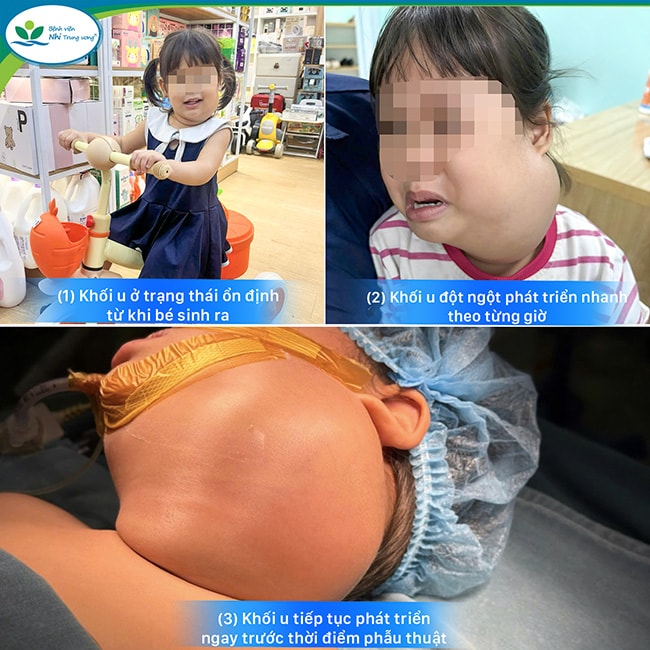 Tuy nhiên, chỉ sau một đêm, khối u đã to lên gấp rưỡi và tiếp tục phình ra rất nhanh. Sau 2 ngày, khối u tăng kích thước gấp 3 lần, chiếm gần như toàn bộ vùng cổ của trẻ, gây chèn ép nghiêm trọng đường thở. “Nhìn con không thở được, gia đình vô cùng hoảng sợ”, bố bệnh nhi nhớ lại.