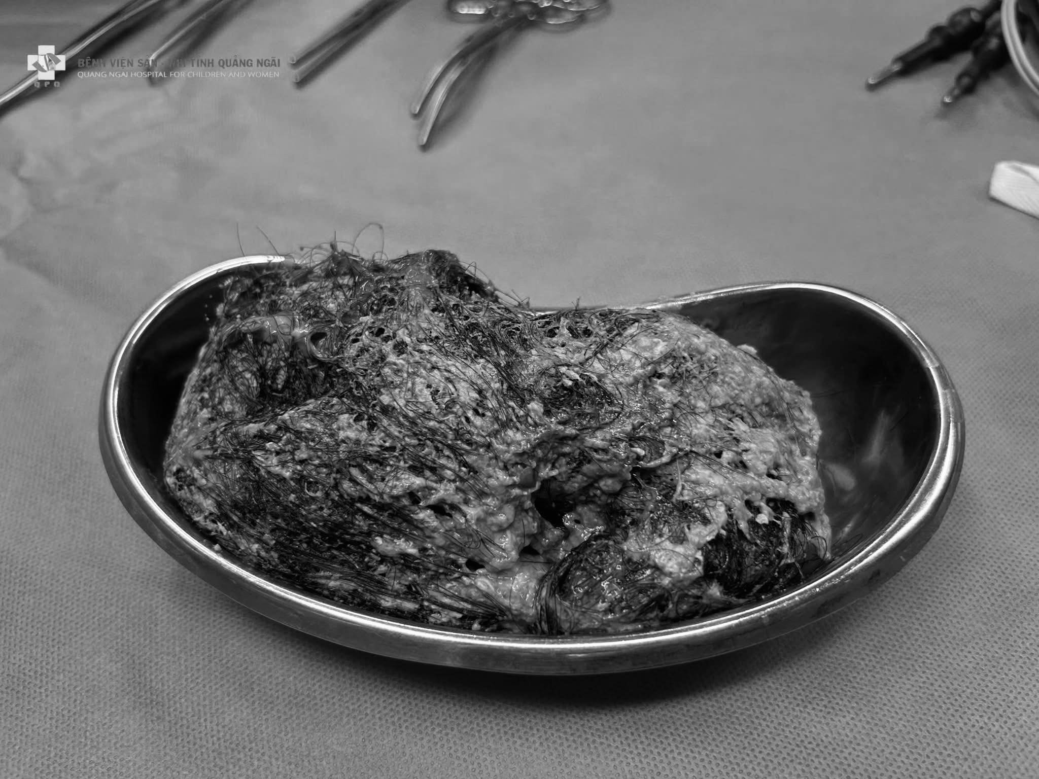 Ngay sau khi hội chẩn, các bác sĩ tiến hành phẫu thuật mở dạ dày lấy dị vật. Ê-kíp đã gắp ra một búi tóc rất lớn, xoắn chặt, nặng khoảng 500 gram, chiếm trọn dạ dày của bệnh nhi.