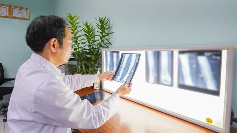 Tiến sĩ, bác sĩ Hoàng Hải Đức đánh giá tổn thương ung thư sụn trước phẫu thuật.
