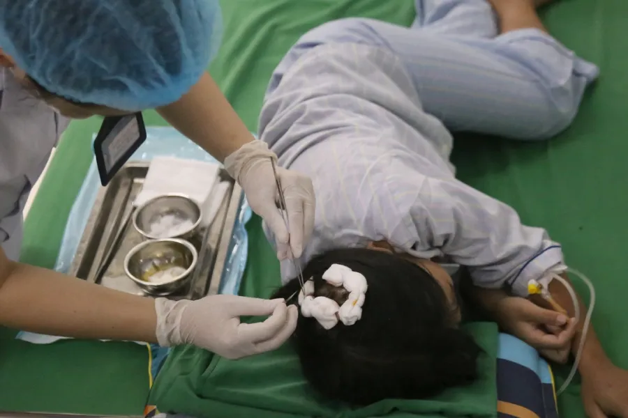 Em L đưa đi cấp cứu với vết thương trên đầu.