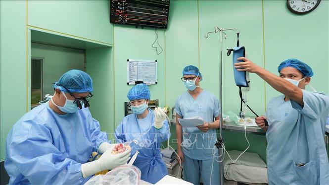 Ê-kíp ghép tạng Bệnh viện Đại học Y dược TP Hồ Chí Minh xử lý quả tim trước khi tiến hành ghép cho bệnh nhi. Ảnh: TTXVN phát